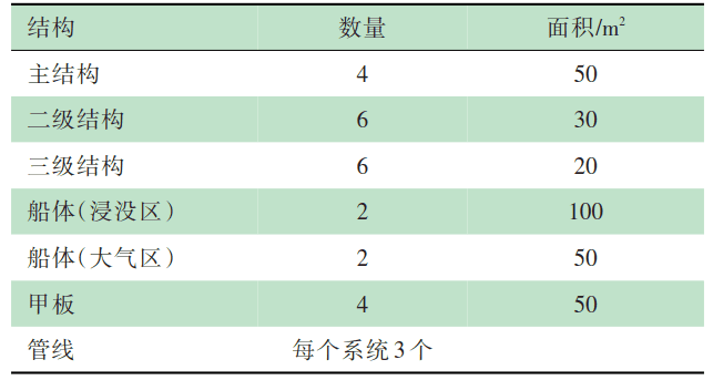 涂层质保项目在项目开工之前需项目参与各方在工程实体上面为每个规定涂层系统选择试验参考面。参考面选择参照ISO 12944-2017测试参考面尺寸和选择指南以及ISO 12944-2017测试参考面的标记、评估和记录报告。选择参考面需参考以下原则:(1)规定系统的典型宏观服役环境,既包含潜在最严酷情况出现、又包含典型环境出现的位置;(2)不应位于因正常操作而受到高风险物理破坏位置;(3)容易评估3年涂层腐蚀条件。通常选择甲板面和节点位置作为涂装参考面。典型参考面如图3所示。