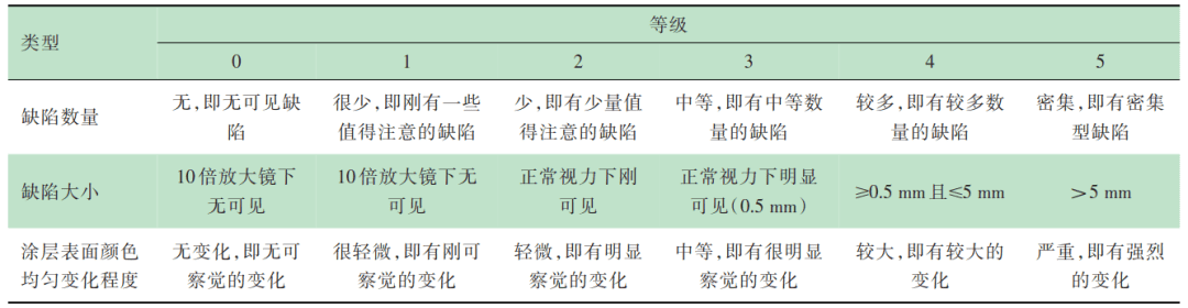 涂层评价根据质保年限,通常要求经过一定的年限按照ISO 4628-2016或ASTM D610标准针对涂层的表面生锈、开裂、剥落、起泡、变色、粉化、丝状腐蚀等缺陷做定性和定量评价,其中包括对缺陷数量评价、缺陷尺寸评价、颜色变化程度评价。