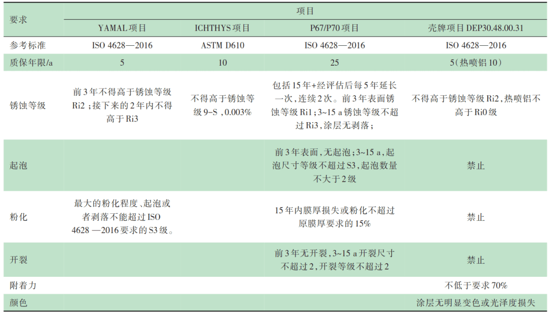 国外海洋平台和液化天然气模块项目在规格书中规定了涂层的质保年限和要求,大部分石油公司的企业标准也提出涂层质保要求,比如壳牌石油公司的工程设计标准DEP30.48.00.31陆上和海上涂层保护中明确对涂层质量保证是5a,储罐和压力容器内涂层质保为10a,热喷铝涂层为10a。表3为笔者对涉及质保的项目进行对比分析,其中涂层缺陷采用标准为ISO 4628-2016或者ASTM D610;质保期限最长达25a,最少是5a;不同项目对锈蚀等级、起泡、涂层粉化、开裂、附着力、颜色等均做不同等级要求。